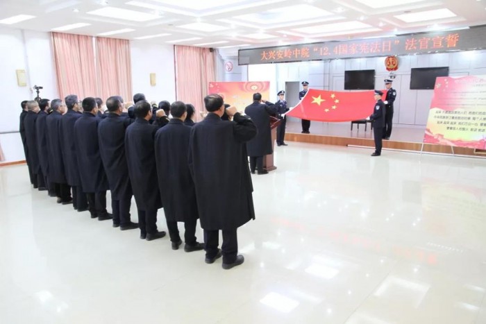 在第五个国家宪法日到来之际,大兴安岭地区中级人民法院举办宪法宣誓活动,表达了人民法官忠实执行宪法和法律,公正廉洁司法,全心全意为人民服务的决心和追求,表达了对党、对祖国、对人民的无限忠诚和庄严承诺。