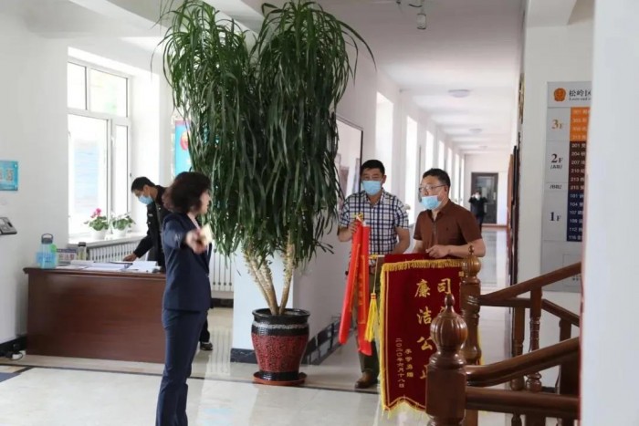 2020年6月18日,当事人李某来到松岭区人民法院,将三面写有“一站服务少诉累、办事高效得民心”“司法为民、廉洁公正”“高效执行扬正义、尽职尽责解民忧”的锦旗分别送到立案庭、综合审判庭、执行局干警的手中。