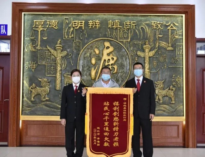 2020年6月1日,当事人李某国向呼玛法院执行局送来了锦旗,李某国激动的握着办案法官贾年军的手说:“感谢您这么长时间奔走嫩江呼玛两地,为我的案子出了这么多力,我真的特别的感动!”