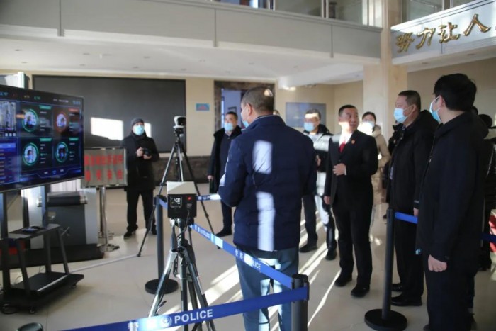 在二楼办公区入口,大家体验中院身份识别自动体温监测仪的使用,听取讲解员对仪器功能及中院利用现代化设施开展疫情防控工作的介绍,纷纷称赞。走进中院视频会议室,应急局和监测中心干部感受视频会议室的科技化设施,说话声音清晰无回声,详细询问墙壁特殊处理方式。