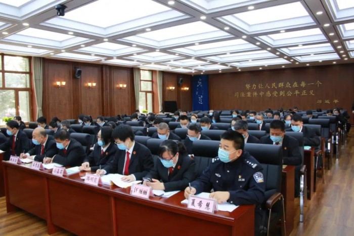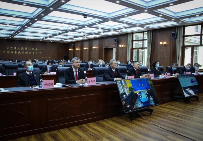 中院党组成员、院领导、全体干警在主会场参会,各基层法院干警在分会场参会。