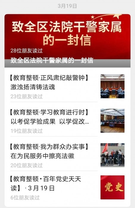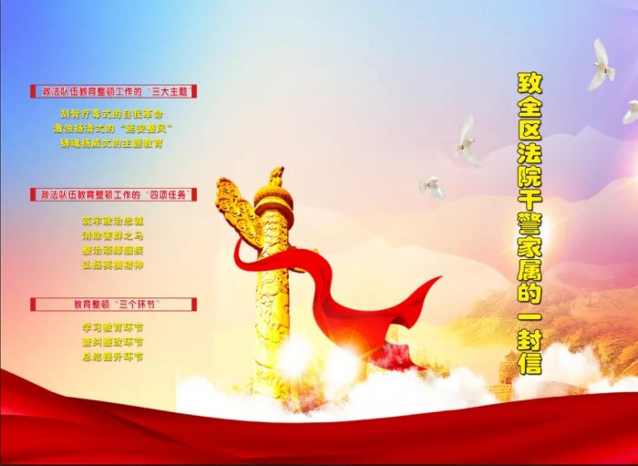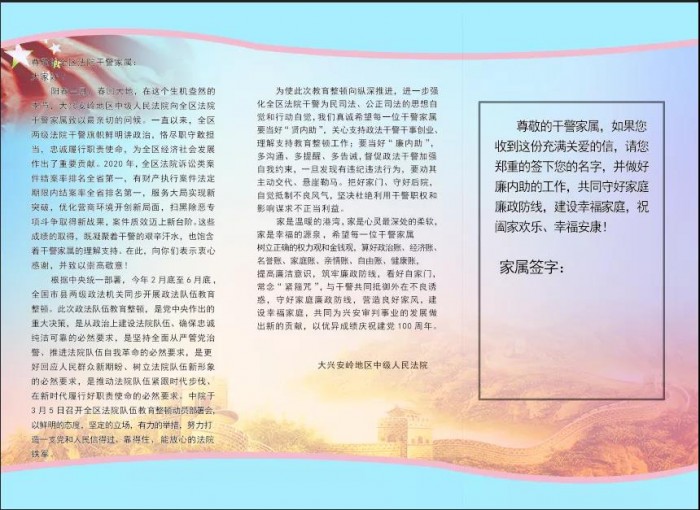 3月19日,大兴安岭地区中级人民法院通过微信公众号发布《致全区法院干警家属的一封信》,信中号召全区法院干警家属们要当好家庭中廉洁自律的守门员和监督员,常吹廉洁风、常打预防针,希望广大家属要当好“廉内助”,筑牢家庭廉洁的“防腐墙”,自觉正好家风、管好家人,用亲情的监督构筑起反腐的大堤。与此同时,为了提高家属知晓率和参与度,中院党组印发纸质版《致全区法院干警家属的一封信》,通过邮寄方式分发到全区法院,请干警家属签收回执,送上廉政叮咛。干警家属反响热烈,纷纷提笔书写廉政警语和对教育整顿工作的支持。