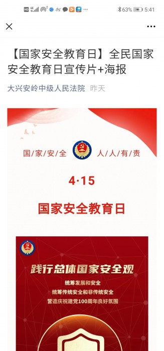 4月15日是我国第六个全民国家安全教育日,为践行总体国家安全观,统筹发展和安全,统筹传统安全和非传统安全,营造庆祝建党100周年良好氛围,大兴安岭地区中级人民法院积极开展全民国家安全教育日宣传活动。