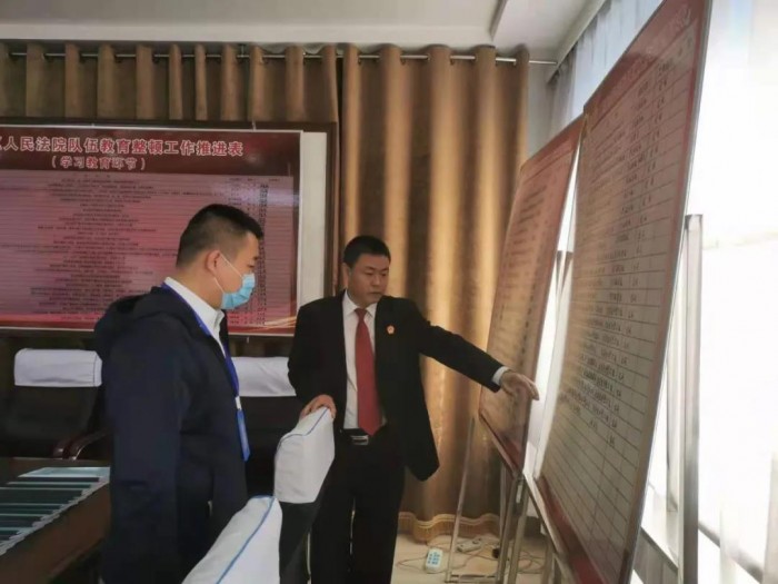 指导组一行首先随机抽查了干警对法院队伍教育整顿应知应会内容的掌握情况,查看了队伍教育整顿查纠整改环节实施方案、部署情况等内业资料,重点检查了干警谈心谈话记录和干警自查事项报告表。