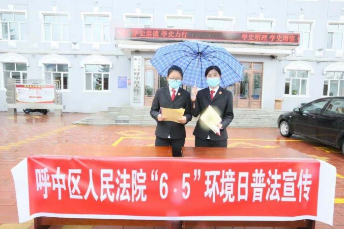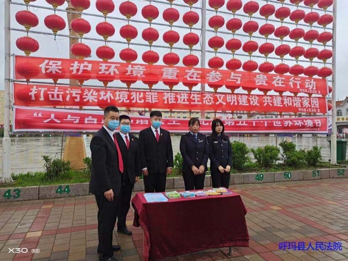 呼中区人民法院在活动现场张挂条幅、设置咨询台、向路过群众发放环保宣传手册、解答群众咨询,并用以案说法的普法形式向群众宣讲环境资源审判及破坏环境犯罪的典型案例,让大家了解环境资源审判工作情况和成效,及环境资源相关法律法规。