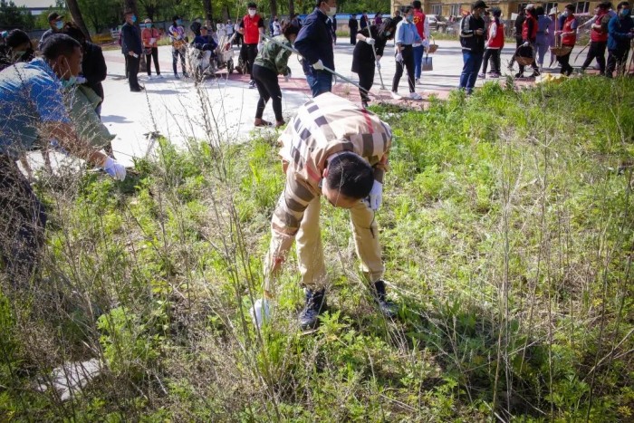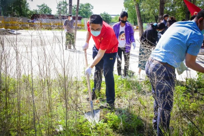 虽然天气十分炎热,但是参加义务劳动的志愿者们发扬志愿服务精神,挥汗如雨,辛勤劳动。用铁锹、夹子和耙子等工具,捡拾石头、砖块等建筑垃圾,清扫枯枝、塑料袋等生活垃圾,三人一队、两人一组,认真清理每个角落,劳动现场呈现出一片热火朝天的景象。