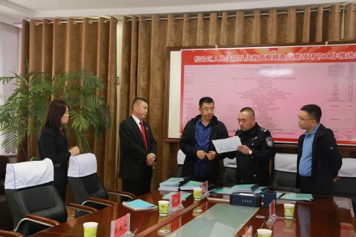 为进一步整治法院六大顽瘴痼疾和四方面突出问题,将查纠整改阶段工作引向深入,不断推进队伍教育整顿工作走深走实,6月9、10日,省法院顽瘴痼疾整治专项督导组成员,省法院督察局二级调研员袁涛、省法院执行局综合处四级调研员刘腾宇下沉到大兴安岭地区中级人民法院及辖区部分基层法院对查纠整改中存在的顽瘴痼疾整治情况进行督导检查。大兴安岭中院党组书记、院长程显波,党组副书记、副院长董宝双,党组成员、政治部主任王笃坤,专审委张立伟一同督导检查。