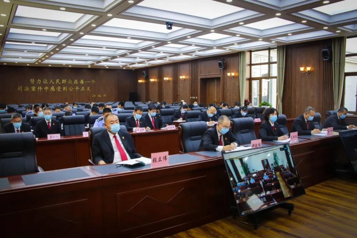 中院党组成员、院领导及全院干警在主会场参会,各基层法院全体干警在分会场参加会议。
