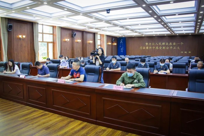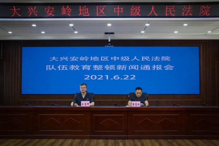 6月22日,大兴安岭地区中级人民法院召开新闻通报会,就查纠整改环节自查自纠、组织查处、专项整治情况向社会通报。中院党组副书记、副院长董宝双主持通报会,党组成员、政治部主任王笃坤向与会人员宣读通报全文。黑龙江日报、大兴安岭日报、大兴安岭电视台等新闻媒体,中院队伍教育整顿各专班负责人,社会群众受邀参加通报会。