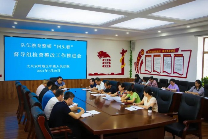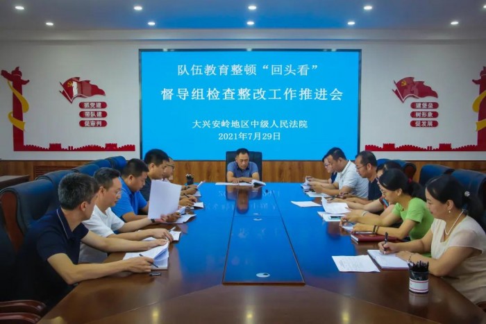 7月29日,大兴安岭地区中级人民法院召开队伍教育整顿“回头看”督导组检查整改工作推进会。会议对政法队伍教育整顿“回头看”督导检查组督导检查反馈问题进行通报,对整改台账涉及问题进行逐项分解,明确责任部门、责任人和完成时限。党组副书记、副院长董宝双主持会议,队伍教育整顿领导小组各专班负责人及工作人员参会。