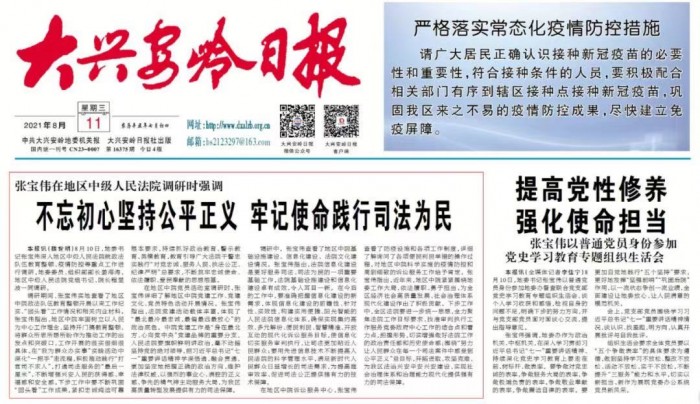 8月11日,《大兴安岭日报》头版以《张宝伟在地区中级人民法院调研时强调不忘初心坚持公平正义 牢记使命践行司法为民》为题报道了地委书记张宝伟深入地区中院调研情况。