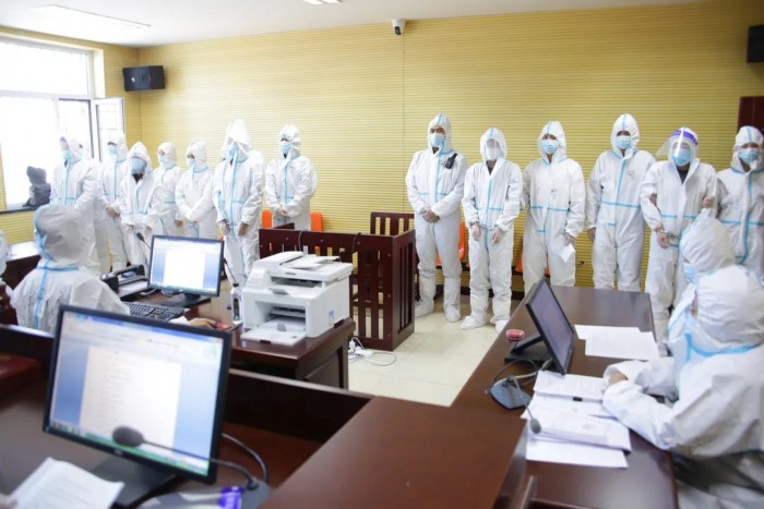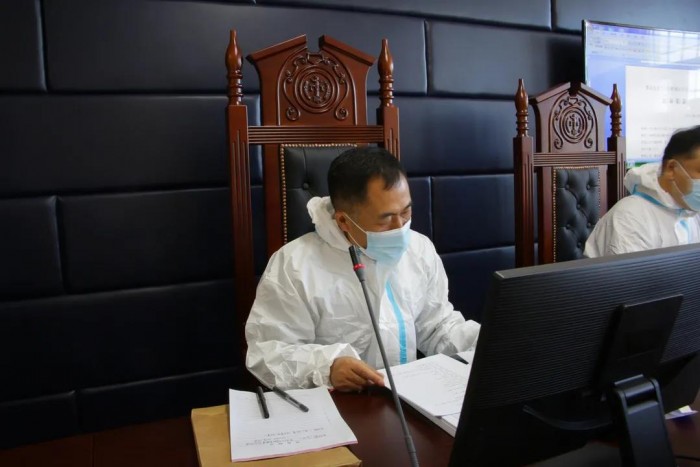近日,大兴安岭地区中级人民法院将庭审现场搬到看守所,对马某林等5人开设赌场罪刑事案件,进行再审开庭。中院党组副书记、副院长董宝双任审判长,庭前,充分征询公诉人、被告人、辩护人的意见,与看守所预约开庭时间和地点。中院干警对开庭场所进行消毒,配备防护装备,做好了各项庭前准备工作。