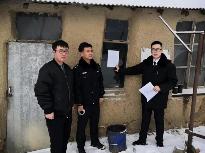 雪大路滑,干警们下车步行5公里才到达被执行人位于山中的住所,但被执行人不在家中,经多方查找也未能找到其本人,干警们遂将罚款决定书留置送达。