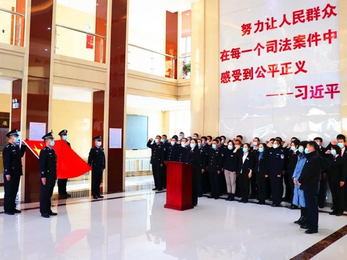 大家面向国旗,高举右拳,整齐而宏亮地宣读誓词,铮铮誓言宣展现了他们忠于宪法、依法履职、服务人民和维护公平正义的信心、决心。