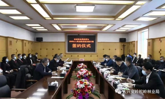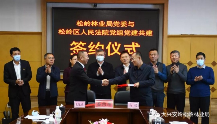 松岭林业局党委书记马铭与松岭区人民法院党组书记、代院长王延成共同签订了党建共建协议书。