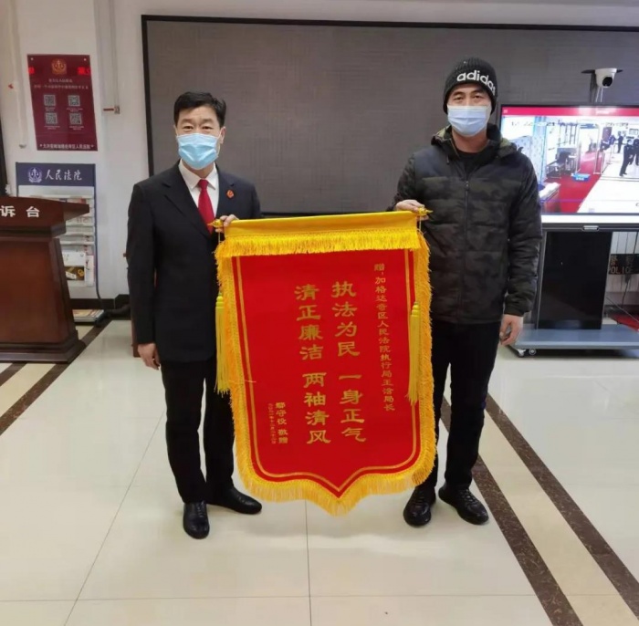 近日,加格达奇区农民工鄢某某从加区法院法官手中接过被拖欠的2.7万元劳务费,他连声感谢并激动地说:“法官,没想到我的钱这么快就执行回来了,这下子我们一家子可以过个舒心年了!”鄢某某还向执行法官敬送了一面锦旗,以表感激之情。