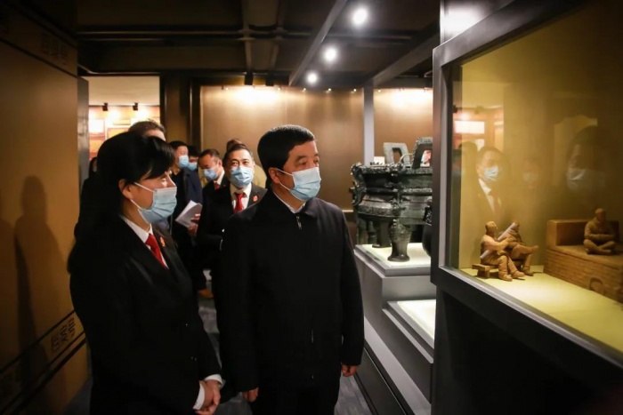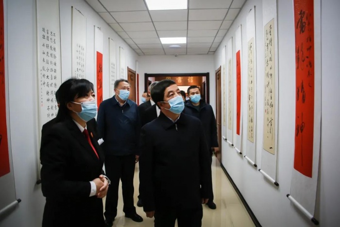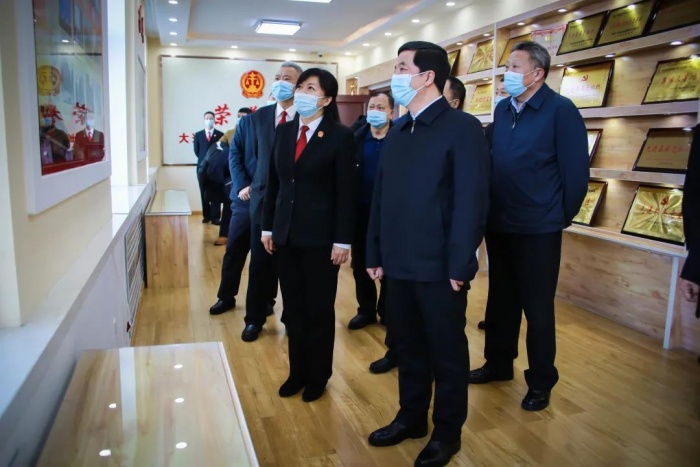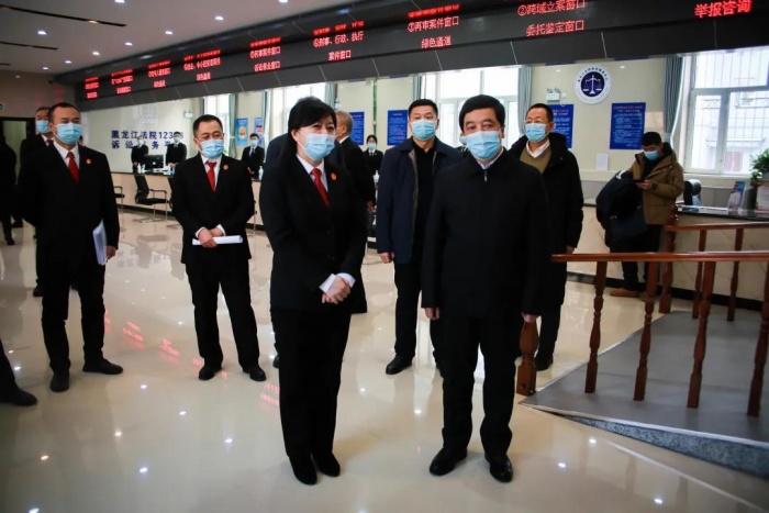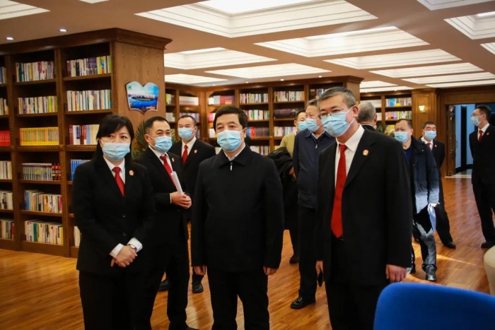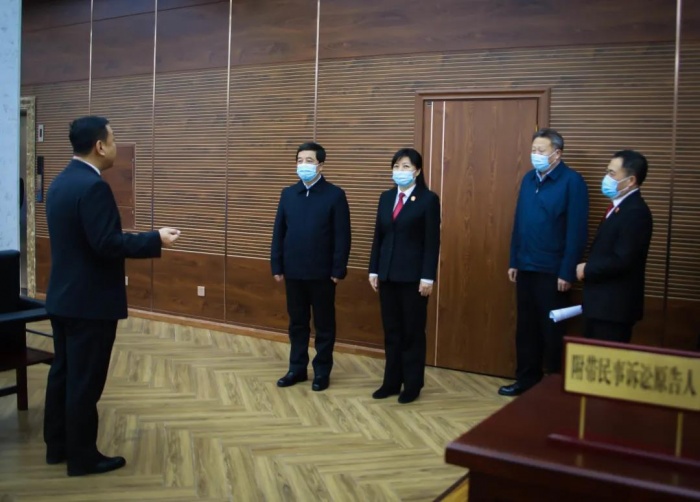 在地区中级人民法院,刘杰一行实地视察了中院审判法庭、视频会议室、党建活动室、审委会会议室、荣誉室、文化长廊、法警体能训练中心、诉讼服务中心、图书馆、在建中的院史馆等场所。刘杰指出,全区两级法院坚持以习近平新时代中国特色社会主义思想为指导,紧紧围绕“努力让人民群众在每一个司法案件中感受到公平正义”目标,坚持服务大局、司法为民、公正司法,尤其是政法队伍教育整顿以来,法院干警筑牢政治忠诚、坚定理想信念、锻造优良作风、锤炼过硬本领,以昂扬精神状态和扎实工作作风,全面提高政治素质和业务能力,为大兴安岭地区转型振兴高质量发展提供了有力的司法保障。