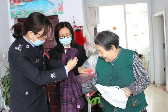 地区中院干警代表来到曙光街道营林社区困难老人家中捐赠衣物。干警代表与老人唠家常,了解家庭情况和生活状况,得知老人独居后,积极询问还有哪些困难,表达了中院的帮扶意愿。