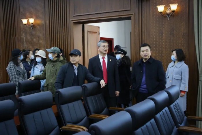 在审判法庭,讲解员为大家介绍了法院审理刑事案件的流程,文艺工作者们纷纷赞叹高科技技术的应用让法庭实现了庭审的同步录音录像和直播,真正体现了审判的公开透明,推进了法院阳光司法工作。