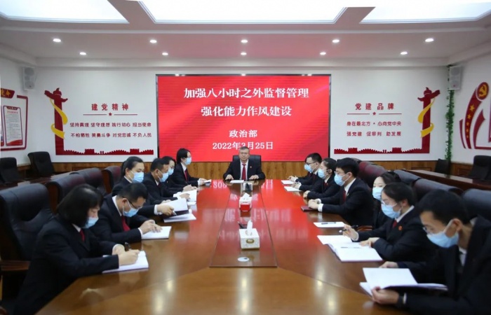 3月25日大兴安岭地区中级人民法院政治部召开专门会议,结合“能力作风建设年”活动,进一步抓好八小时之外纪律作风建设,确保干警和工作人员八小时之外生活健康阳光、积极向上。中院党组成员、政治部主任王笃坤主持会议,政治部全体干警和工作人员参加会议。