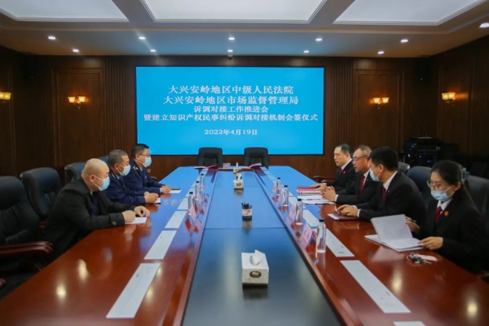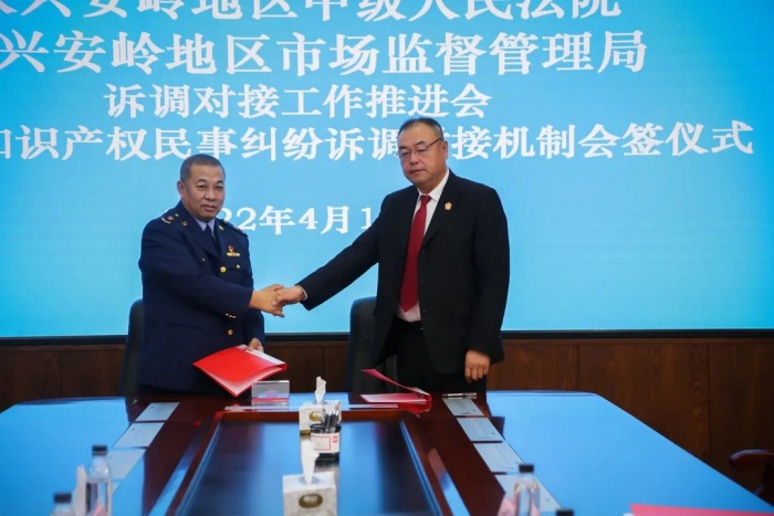 4月19日,在第22个世界知识产权日到来之际,大兴安岭地区中级人民法院与地区市场监督管理局召开知识产权诉调对接机制签约仪式,旨在健全多元化纠纷解决机制,加强诉讼与非诉讼矛盾纠纷解决方式的有效衔接,及时依法维护知识产权权利人的合法权益。中院党组成员、专审委张立伟、地区市场监督管理局四级调研员周尊义出席签约仪式。