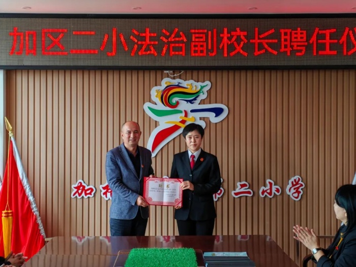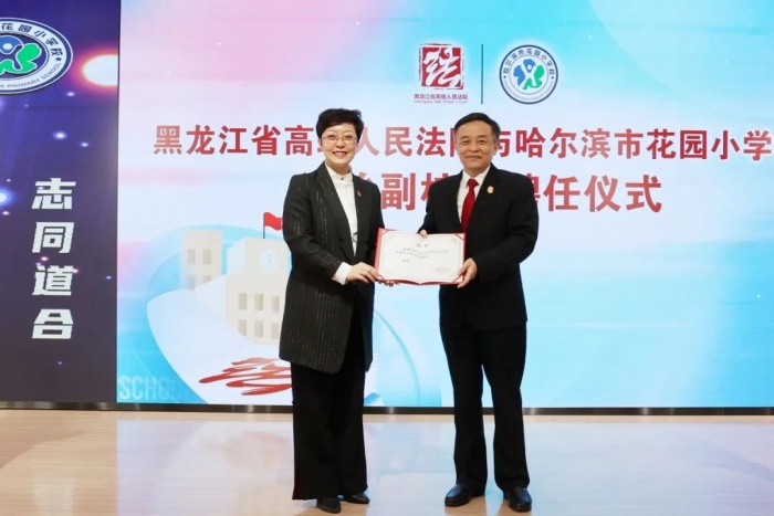 在当天举行的省法院与哈尔滨市花园小学校法治副校长聘任仪式上,全国人大代表、哈尔滨市花园小学校校长曹永鸣向石时态颁发了法治副校长聘任书。哈尔滨市副市长陈远飞参加聘任仪式并致辞。
