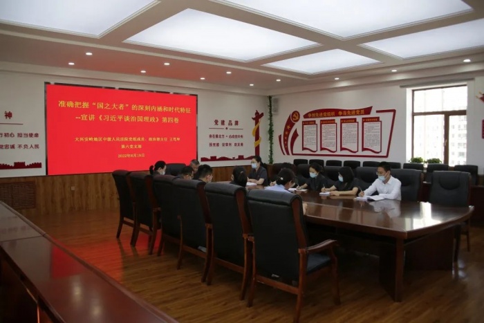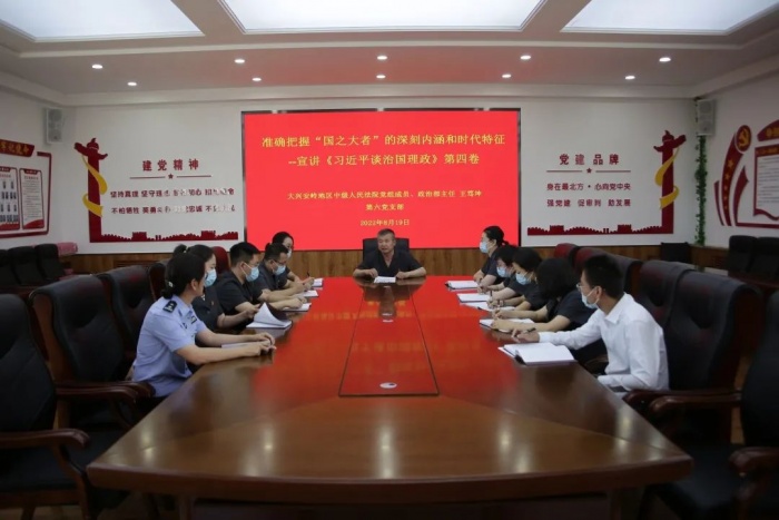 8月19日下午,大兴安岭地区中级人民法院第六党支部召开支部大会,由党组成员、政治部主任王笃坤讲党课,宣讲《习近平谈治国理政》第四卷。机关党委选派党员代表参加了此次宣讲。