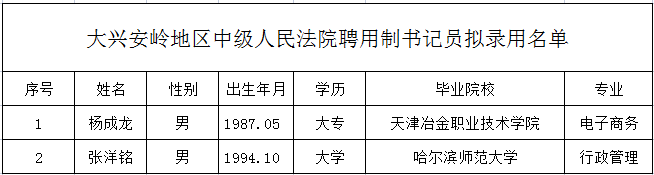 按照《大兴安岭地区中级人民法院2022年公开招聘聘用制书记员公告》要求,经报名、资格审核、考试、体检、考察等程序,拟补录以下人员为大兴安岭地区中级人民法院聘用制书记员。