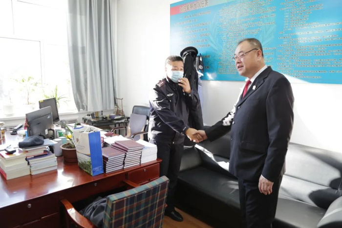 1月10日,在第三个“人民警察节”到来之际,大兴安岭地区中级人民法院党组成员、审判委员会专职委员张立伟代表中院党组向司法警察支队送上节日慰问,参观中院新建的警营文化长廊,并对警务工作进行检查。法警支队负责人参加活动。