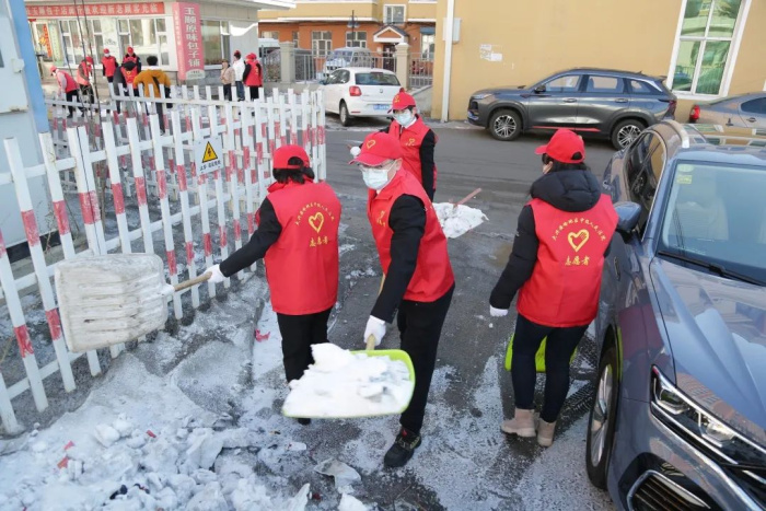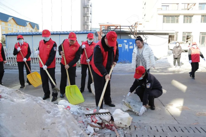 中院志愿者身穿志愿者马甲,手拿雪铲、爬犁等工具分工合作,对曙光街道包片场地的积雪进行仔细清理。春风料峭的时节,积雪不及时清理就会因无法照射到阳光在路上形成积冰,给居民行走路上造成危险。中院干警们相互配合,齐心协力,男生女生齐动手,耙雪、铲雪,充分发挥不怕累、不怕脏的精神,以实际行动爱护环境,清洁卫生,践行雷锋精神。