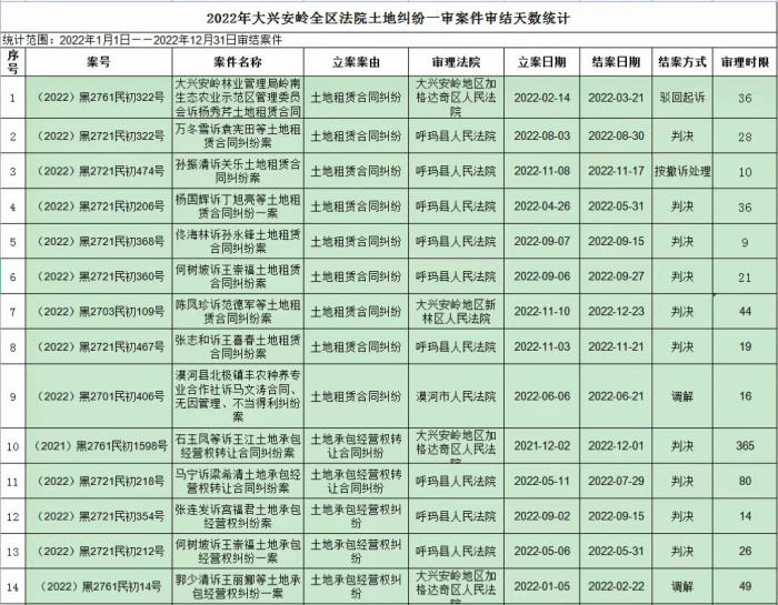 2022年大兴安岭全区法院土地纠纷一审案件统计公告