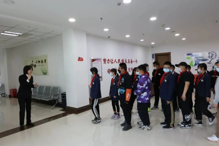 加区法院少年法庭负责人、加区七小法治副校长王丹丹带领七小师生先后参观了诉讼服务大厅、审判法庭及图书室。参观结束后,在刑事审判庭王丹丹结合审理的案件,就未成年人权益司法保护和犯罪预防、禁毒教育、环境保护等多方面法律知识给孩子们上了一节生动的法治课。
