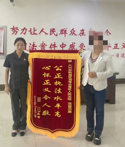 近日,加格达奇区人民法院来了位特殊的访客刘某,她是一起执行案件的被执行人。她专程将一面书有“公正执法水平高、心怀正义令人敬”字样的锦旗赠送给执行局,称赞加区法院执行工作“廉洁高效、倾心为民”,承办人工作作风“平易待人,百问不厌”,对人民法院耐心、细致、负责、高效的工作作风表示感谢和赞扬。