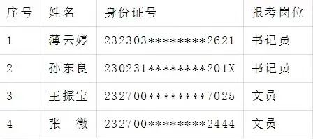 按照《大兴安岭地区中级人民法院公开招聘聘用制人员公告》要求,经报名、资格审核、考试、体检、考察等程序,拟聘用以下人员为大兴安岭地区中级人民法院聘用制人员。