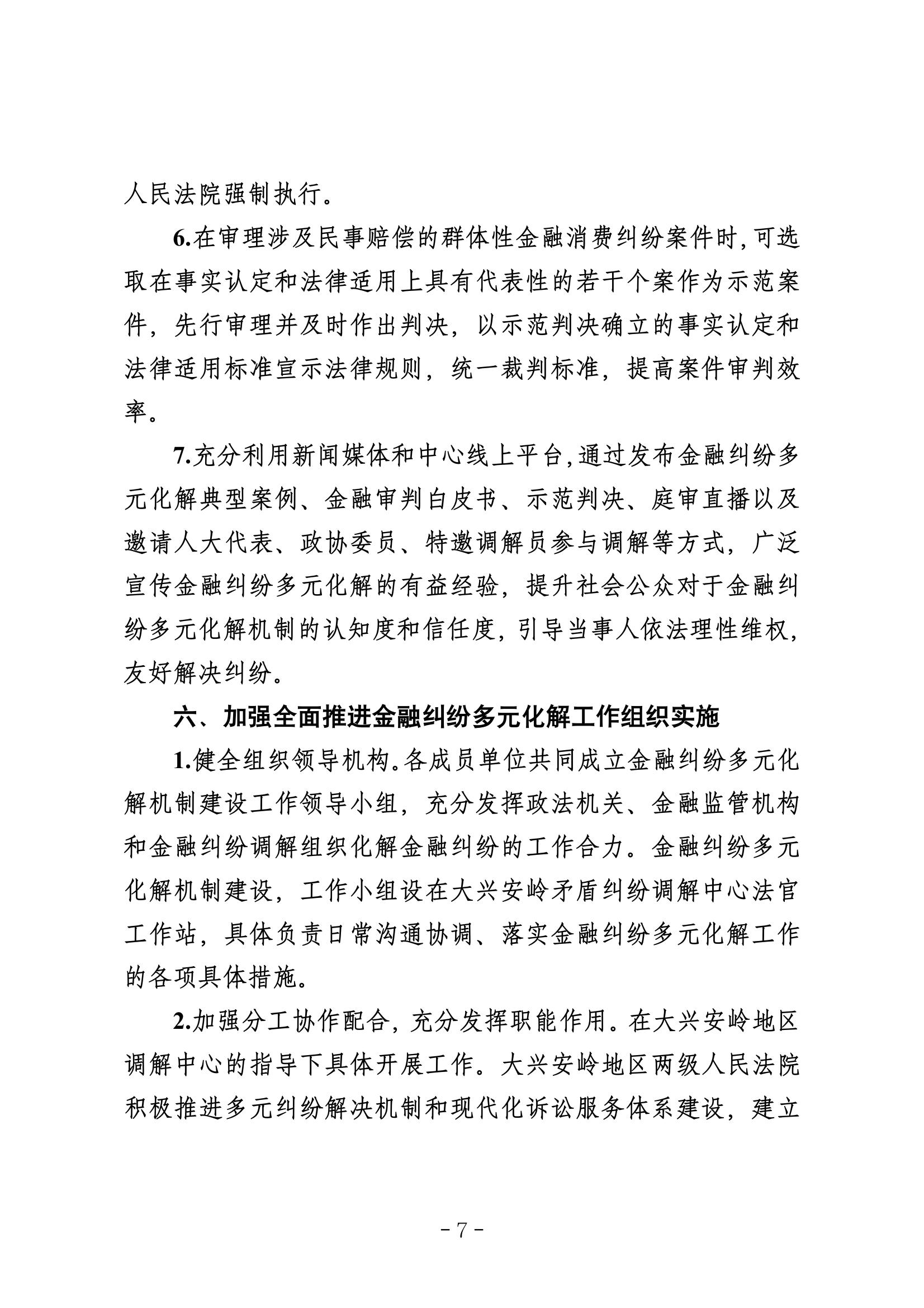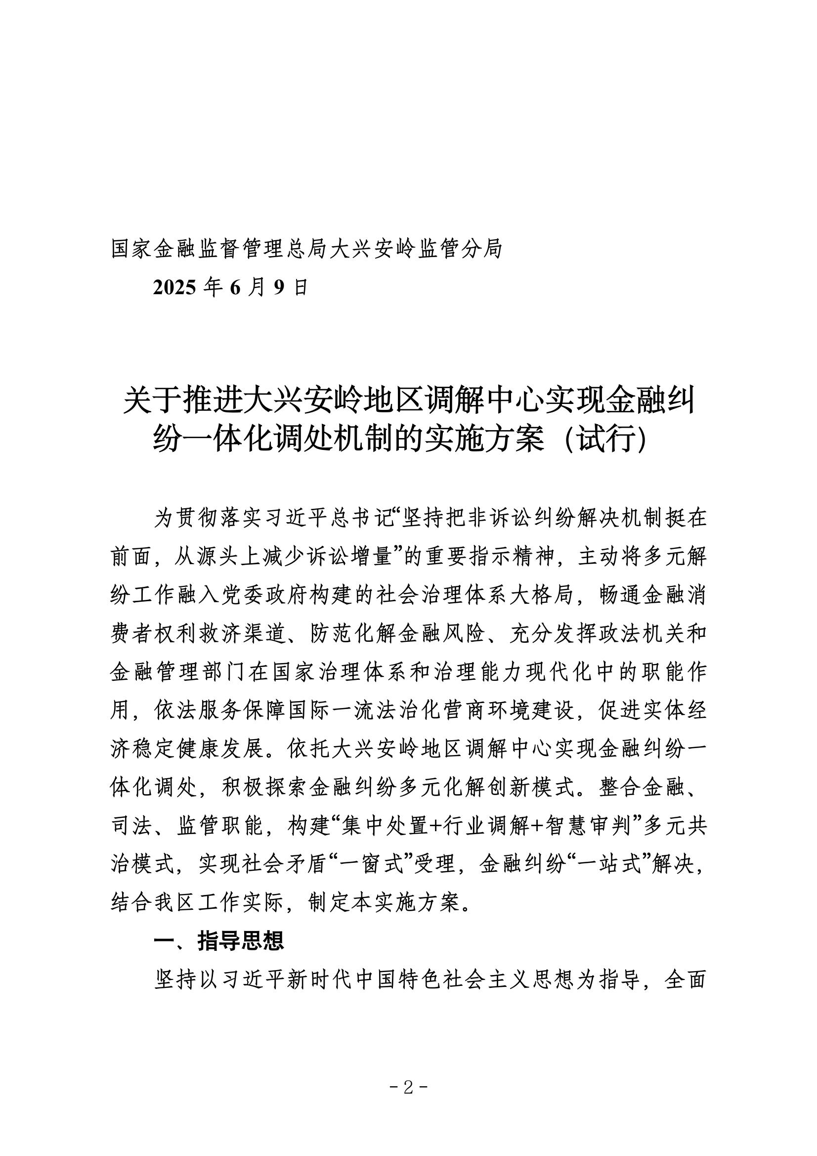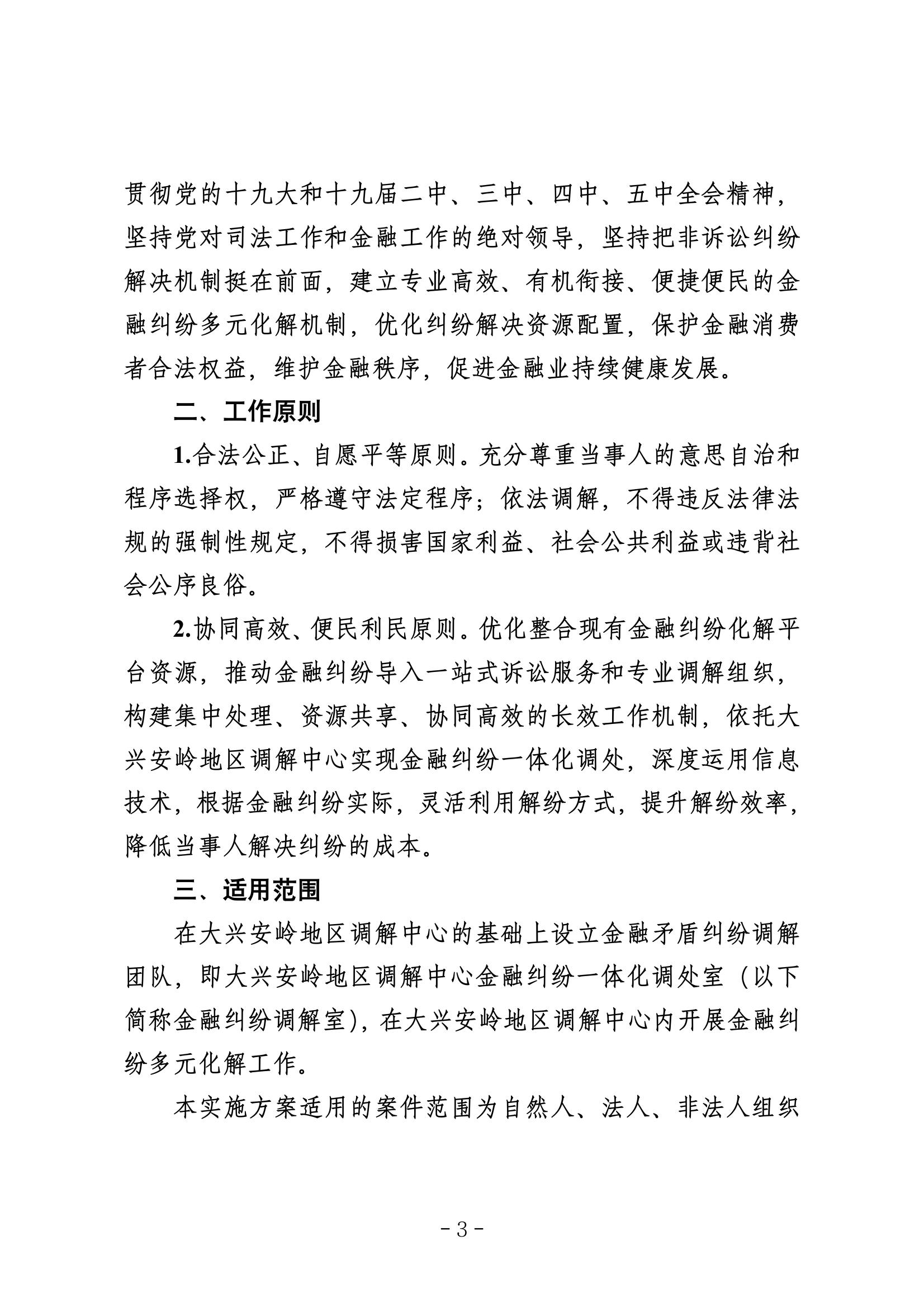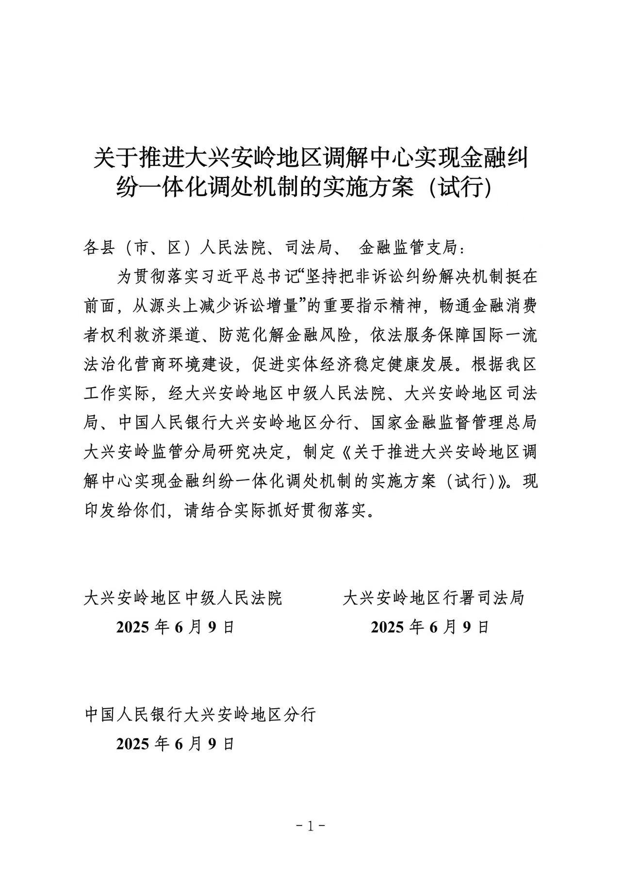 关于推进大兴安岭地区调解中心实现金融纠纷一体化调处机制的实施方案(试行)