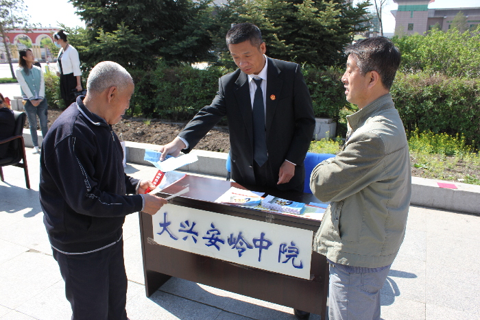 2015年5月28日上午,大兴安岭地区中级人民法院在加格达奇区世纪广场开展了防范打击非法集资集中教育宣传日活动。这次活动是由大兴安岭地区打击和处置非法集资工作领导小组组织开展,目的是为了提高社会公众对非法集资的防范意识和识别能力,从源头上有效遏制我区非法集资活动,引导和提高社会公众对非法集资危害性的认识,营造防范打击非法集资的良好社会论氛围,维护我区金融市场秩序,保障人民群众的合法权益。