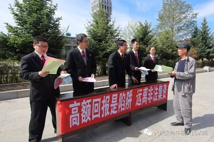 大兴安岭中院坚持“面向基层、面向公众、注重实效、注重创新”的原则,以保护人民群众切身利益、维护社会稳定为出发点,开展防范非法集资宣传活动。利用悬挂宣传条幅,设置咨询点,宣传讲解,分发宣传资料等形式,向广大群众介绍非法集资的主要特征、表现形式和常见手段,揭露犯罪分子的惯用伎俩,提高公众的警惕性,打消侥幸心理,使非法集资活动没有市场,积极宣传打击和处置非法集资的法律、法规和政策,让广大群众充分认识到参与非法集资不受法律保护,增强“买者自负”和“风险自担”意识,教育群众远离非法集资。